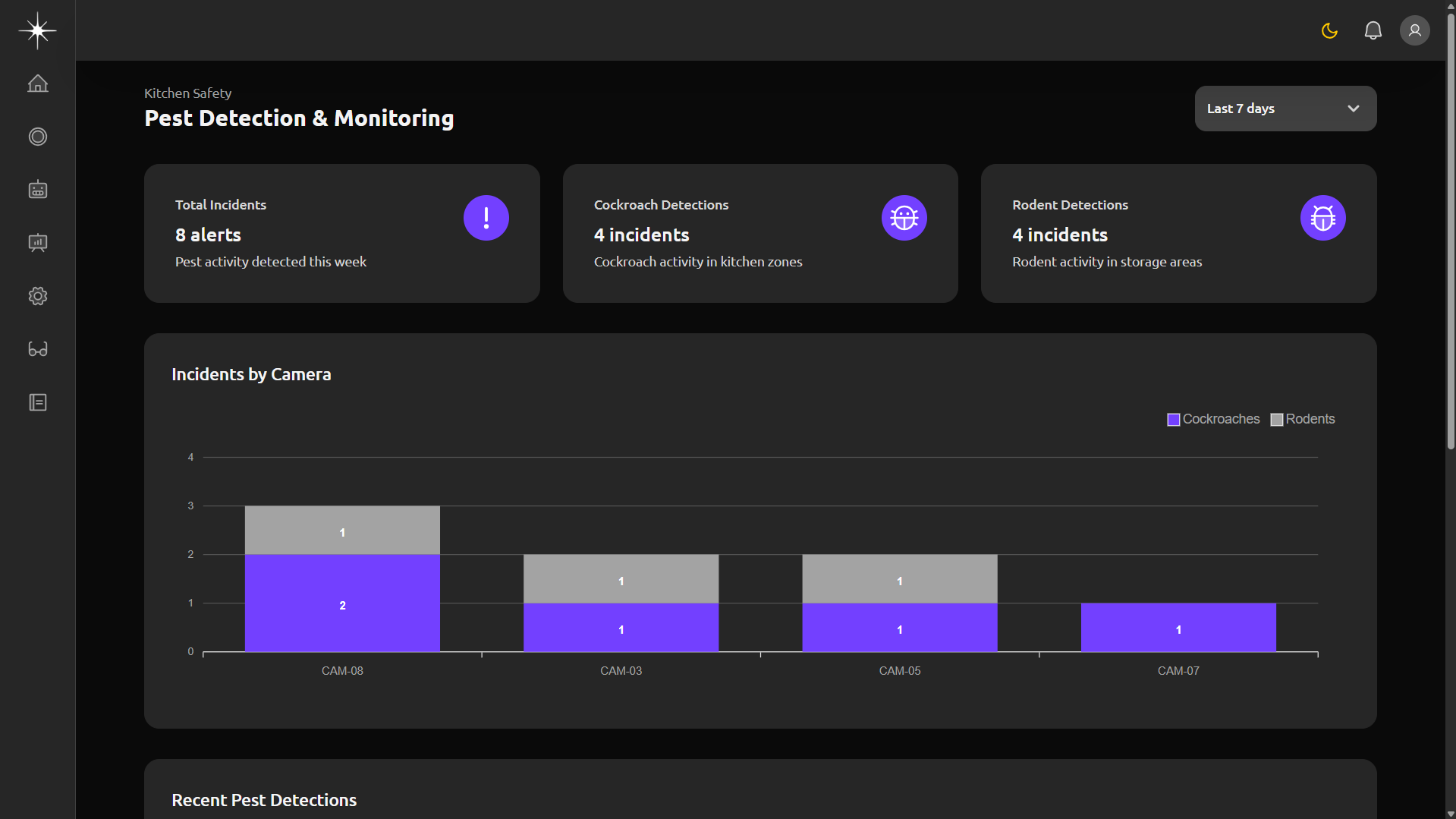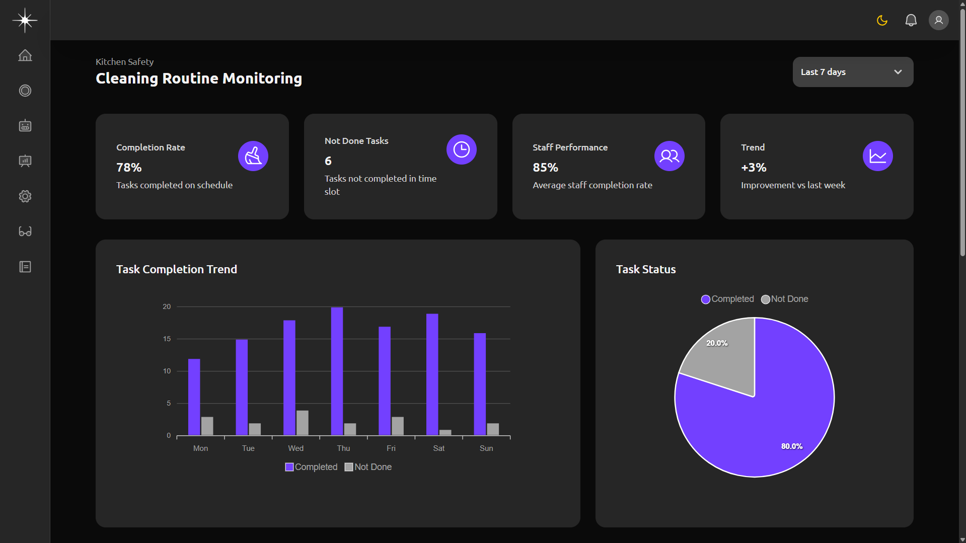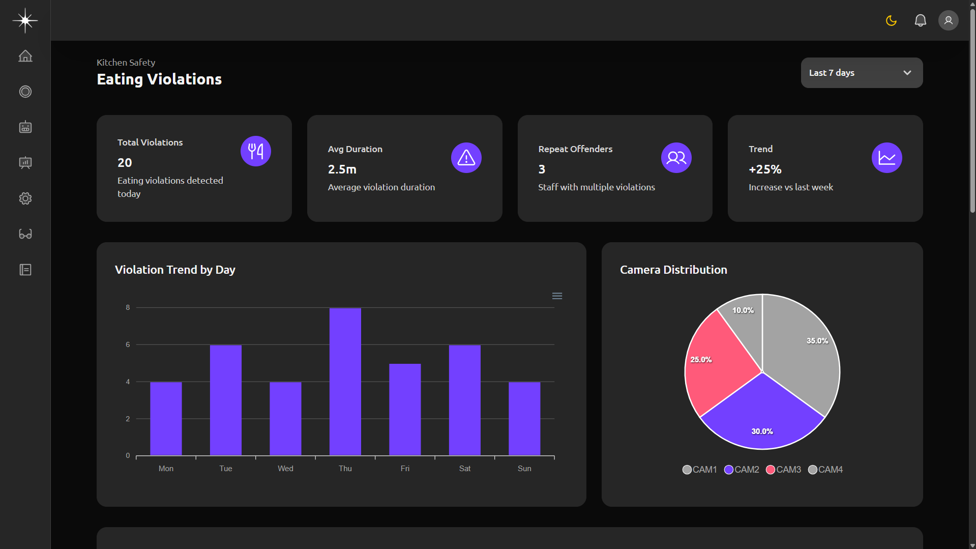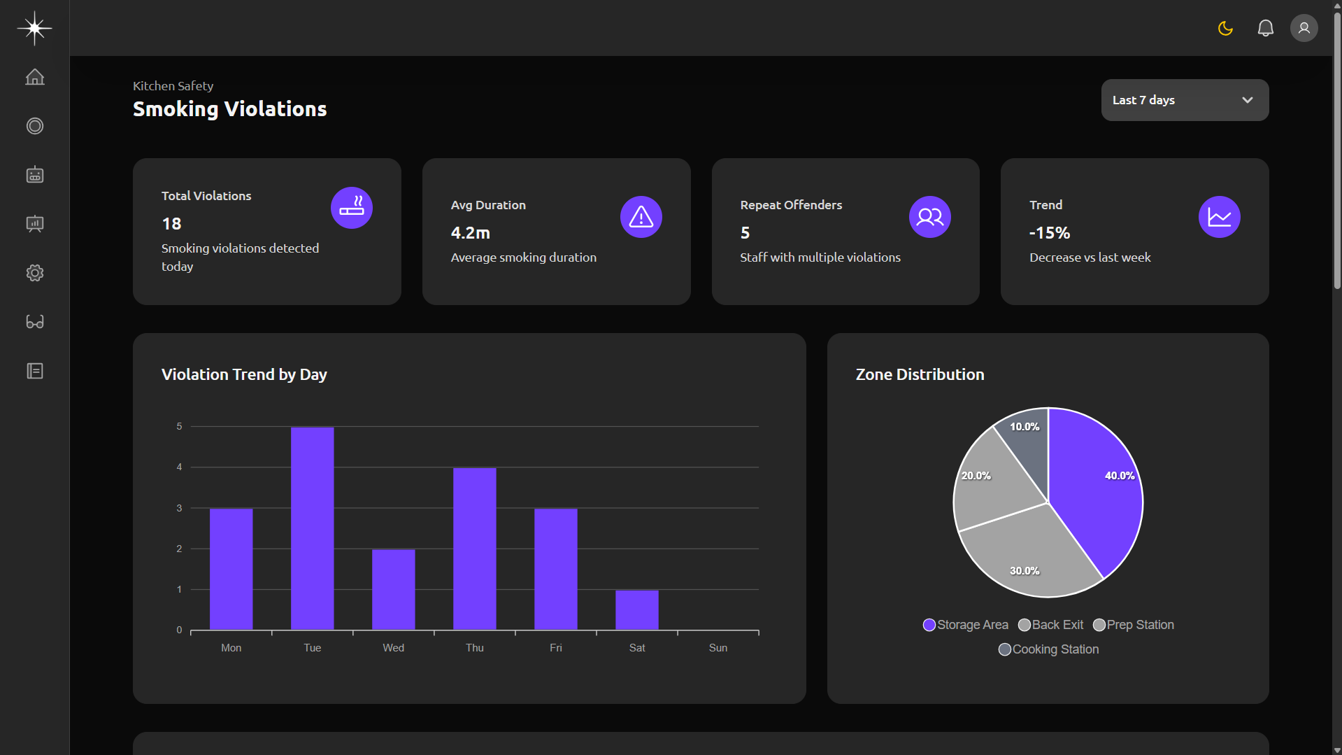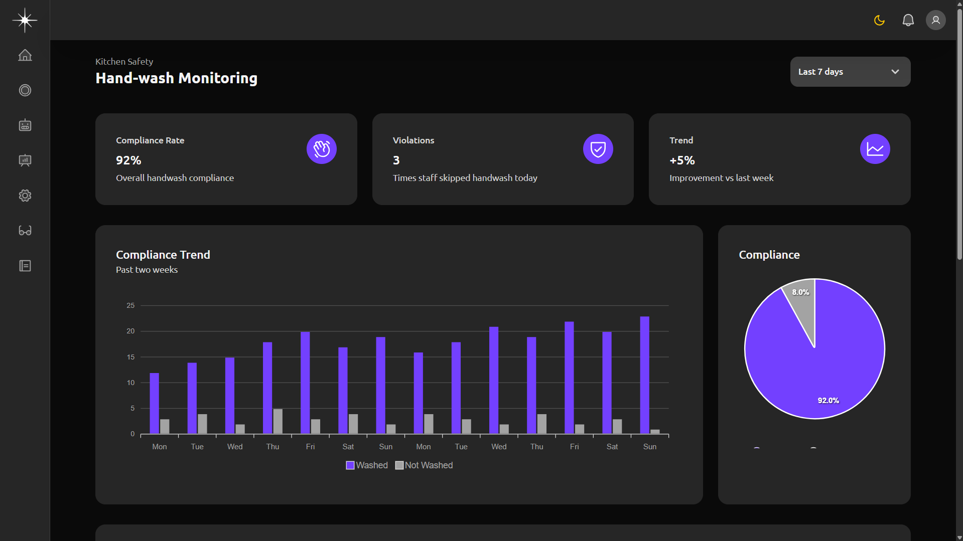 Comprehensive monitoring of all kitchen safety parameters including hand-washing compliance, PPE usage, cleaning routines, and operational violations.